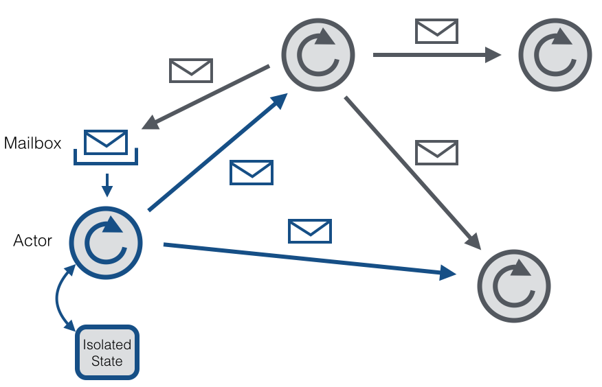 Akka是一个开发并发、容错和可伸缩应用的框架。它是Actor Model的一个实现,和Erlang的并发模型很像。在Actor模型中,所有的实体被认为是独立的actors。actors和其他actors通过发送异步消息通信。Actor模型的强大来自于异步。它也可以显式等待响应,这使得可以执行同步操作。但是,强烈不建议同步消息,因为它们限制了系统的伸缩性。每个actor有一个邮箱(mailbox),它收到的消息存储在里面。另外,每一个actor维护自身单独的状态。一个Actors网络如下所示: