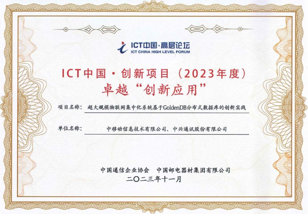 2023年11月30日,“第四届数字化转型推动高质量发展大会”在海口顺利举办,大会召开“ICT应用创新发展论坛”,并发布由中国通信企业协会负责的“ICT中国(2023)案例”。本次评选共征集800余个有效案例,中移动信息技术有限公司(以下简称“中移信息”)与中兴通讯联合申报的“超大规模物联网集中化系统基于GoldenDB分布式数据库的创新实践”从中脱颖而出,荣获卓越一等案例!