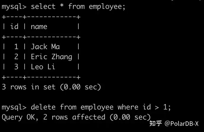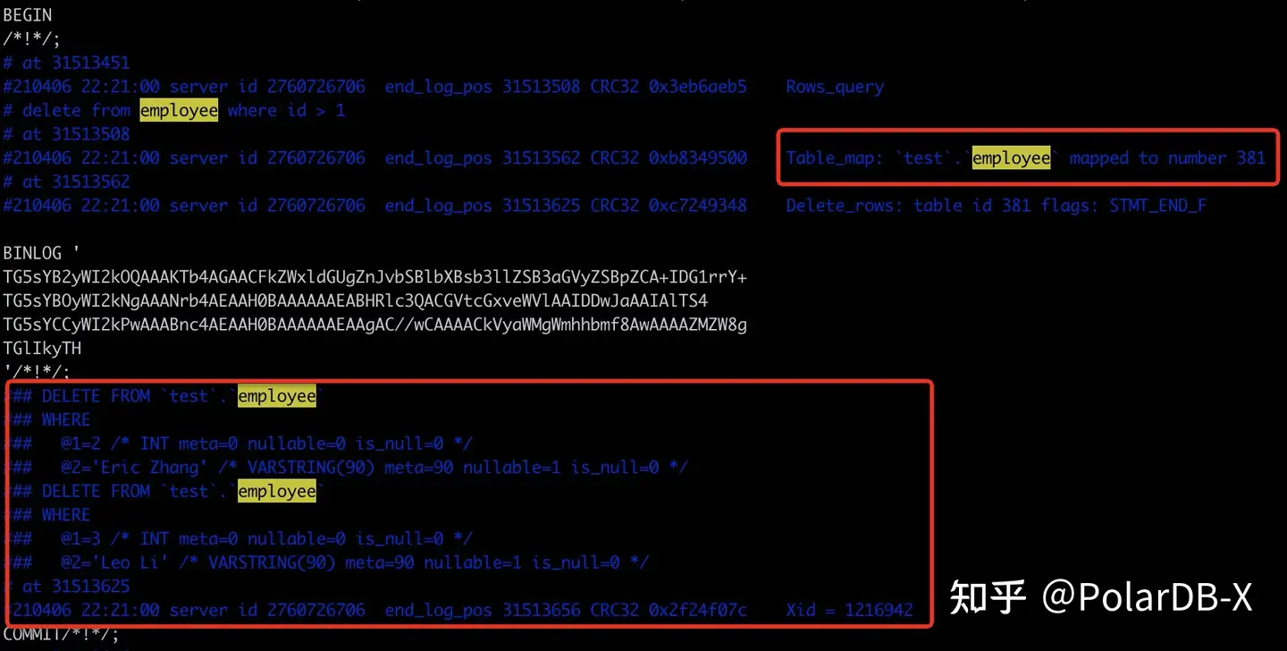 对于上图中的 employee 表,当我执行如下的 delete 语句删除了两行数据后,对应的binlog中的记录是如下图所示: