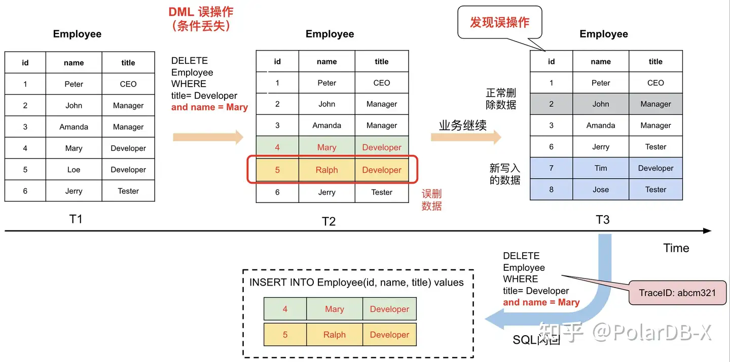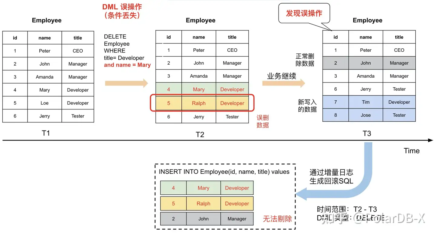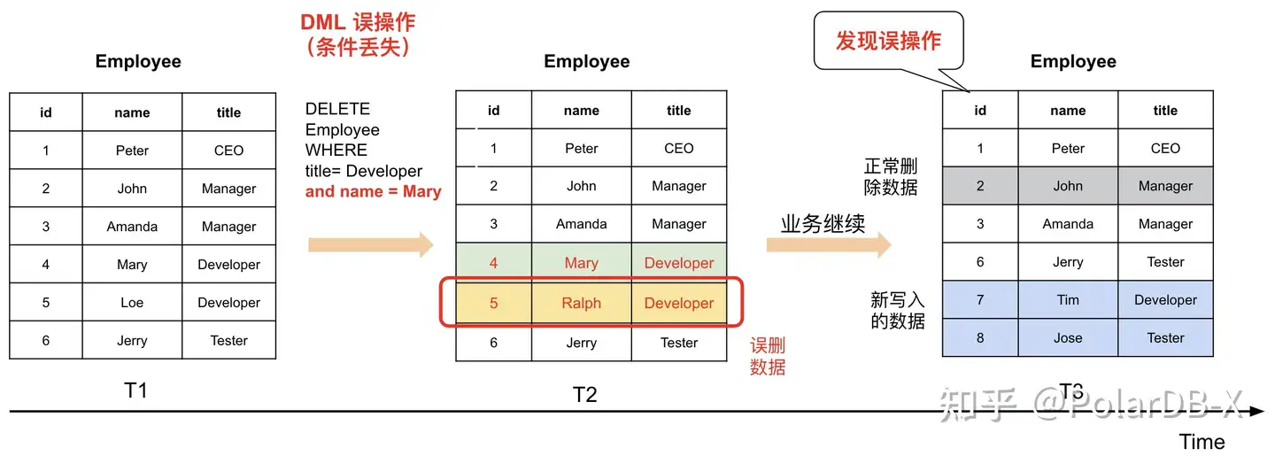 - T3:此时业务仍在继续,John 被删除, Tim 和 Jose 被插入到表中。而此时粗心的小明发现了数据被误删,迫切希望恢复数据。