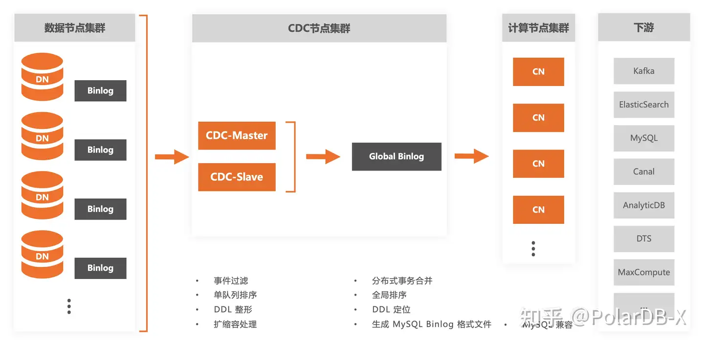 2. CDC 组件将所有“干净”的增量事件队列进行合并,期间会对属于同一分布式事务的事件进行合并,并会根据事务时间戳进行全局排序,这样便得到一个全局有序的保障事务完整性的事件队列,同时该阶段还会处理好 DDL 在队列中的位置。之后 CDC 组件会将该队列生成兼容 MySQL Binlog 格式的文件,即全局 Binlog 文件;