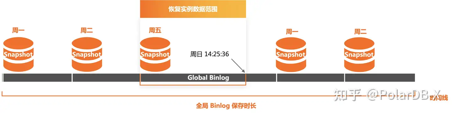以上图为例,比如我们有一个 PolarDB-X 实例每周一、周二和周五的零点进行备份,某天产生一个需求,需要将数据恢复到周日的 14:25:26,那么我们的系统会选择离恢复点最近的一个全量备份集---- 也就是周五零点点这份,并从周五零点开始重放全局 Binlog,直到周日 14:25:26 结束,这样我们便得到了想要的快照。