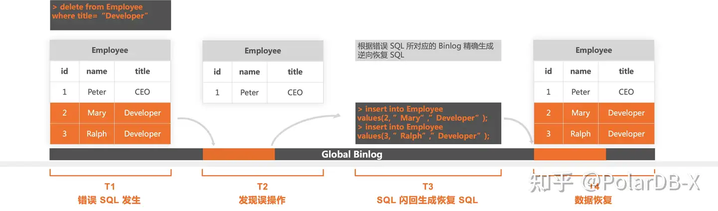 如上图所示,在 T1 时我们想把职位是 "Developer" 名字是 "Ralph" 的记录删掉,但 WHERE 条件中忘了加 "name='Ralph'" ,导致名字为 "Mary" 的记录被一同删掉了。这两个删除事件以及对应 SQL 的 ID 会被记录在全局 Binlog 中。