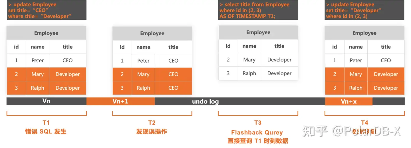 如上图所示,T1 时我们想把职位是 "Developer" 名字是 "Ralph" 的记录职位更新为 "CTO",但 WHERE 条件中忘了加 "name='Ralph'",导致所有职位是 "Developer" 的记录都被更新成了 "CTO"。这些变更都会记录在版本为 Vn+1 的 undo log 中(undo log 是数据库中的一个基础数据结构,里面详细的记录了每行数据的变更内容,可简单类比成 GIT commit log)。