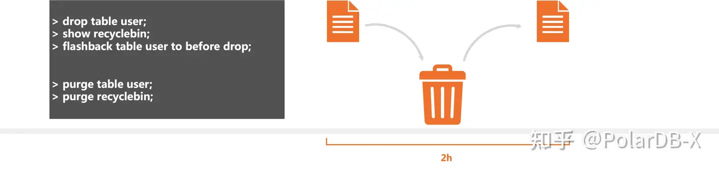 PolarDB-X 提供的第二项数据恢复能力叫做表回收站。顾名思义,我们会将 DROP 的表临时放入一个回收站,若两小时内发现需要恢复该表,那么可以在回收站中找回。