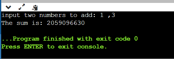 #include <iostream>using namespace std;int main(){int a, b;int sum=a+b;cout<<"input two numbers to add: ";cin>>a;cin>>b;cout<<"The sum is: "<<sum;return 0;}