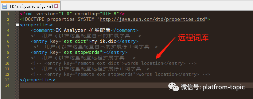 <?xml version="1.0" encoding="UTF-8"?><!DOCTYPE properties SYSTEM "http://java.sun.com/dtd/properties.dtd"><properties><comment>IK Analyzer 扩展配置</comment><!--用户可以在这里配置自己的扩展字典 --><entry key="ext_dict">my_ik.dic</entry><!--用户可以在这里配置自己的扩展停止词字典--><entry key="ext_stopwords"></entry><!--用户可以在这里配置远程扩展字典 --><entry key="remote_ext_dict">http://**.**.**.230/dic/my_origin_ik.dic</entry><!--用户可以在这里配置远程扩展停止词字典--><!-- <entry key="remote_ext_stopwords">words_location</entry> --></properties>