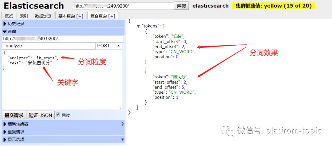 我们再回到head插件后,再次提交请求查看一下效果,可以看到,此时ik分词器已经成功生效了,关键字"安装器词分"已经被分析为两个关键字了,分别是"安装"、"器词分";如下图所示: