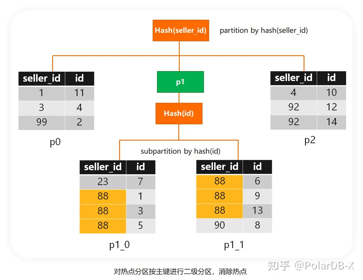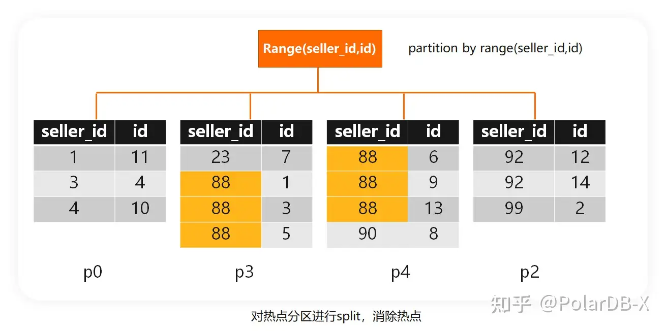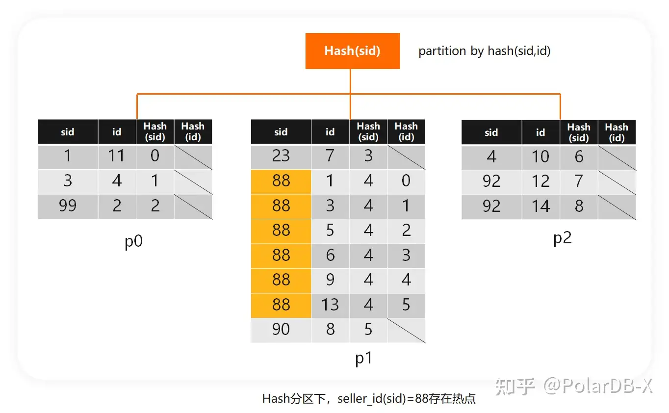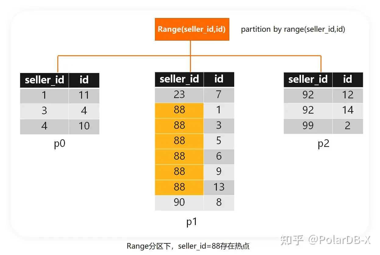 例子中,seller_id=88的数据集中在分区p1,这个分区相对于其他分区就是明显的热点。