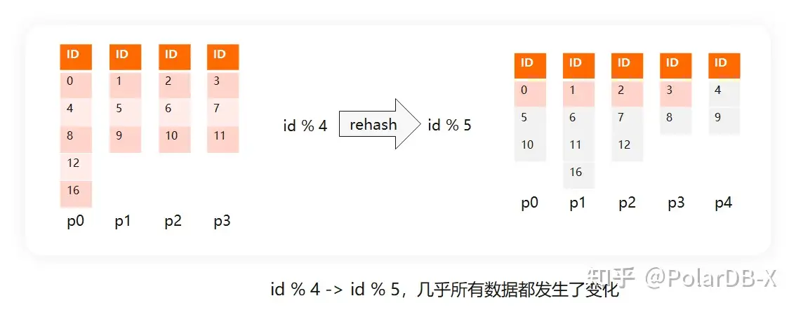 例如,当前是4个分片,其取模算法就是ID % 4,当你要增加到5个分片的时候,取模算法就是ID %5,这时你会发现,超过80%的数据都要重新移动,其代价和完全重建一遍数据没有什么太大差异,如图: