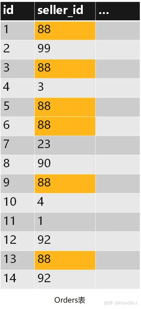 这个字段表示的是卖家ID,我们可以想象到,电商系统里一般会存在一些大卖家,例如天猫超市,就是淘宝系统里的一个大卖家。这种大卖家会产生非常多的订单,如上图,sdx这个Global Index,seller_id=88的数据行会非常的多,远高于普通的卖家。