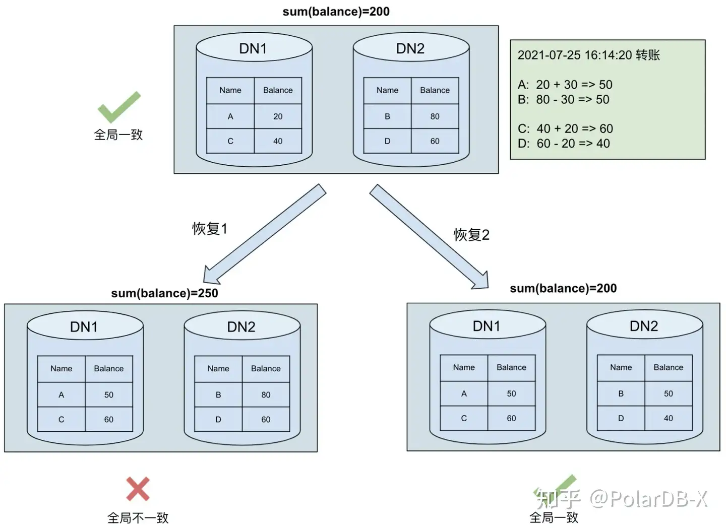 上图通过经典的转账测试给出了数据一致性的例子。用户的账户余额表分布在两个数据节点中,某一时刻,通过分布式事务,账户C 向账户A转账了30元,账户D向账户C转账了20元。如果将数据节点恢复至该时刻,由于任意时间点恢复只能精确到秒级,因此恢复出的数据可能出现 A,C 账户完成了转账操作,而 B,D 账户还未完成的情况(如情况1),此时数据便出现了不一致,这对于用户是不可接受的。需要保证恢复出的数据,要么是转账前的状态,要么是转账完成后的状态。