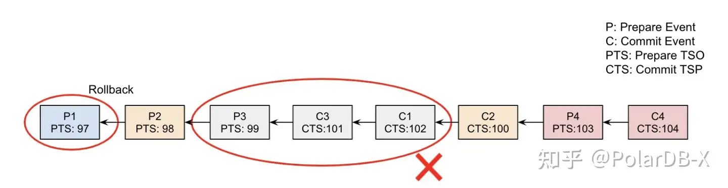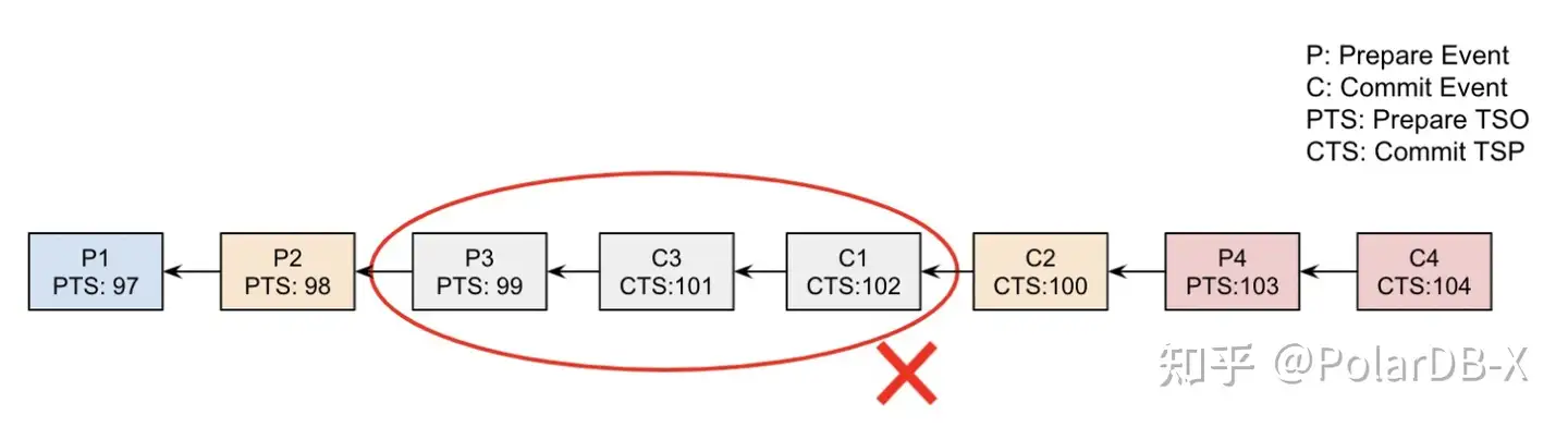 有了 stop_tso 之后,我们便能在出现第一条大于该值的event的时候终止裁剪流程。例如对上面的例子,恢复时间点的tso 是100, 但是 stop_tso 经过计算,是103,我们按照这个条件,便能对对应的binlog进行剔除,剔除后的效果如下图所示,P3,C3,C1 三个event都需要被剔除。