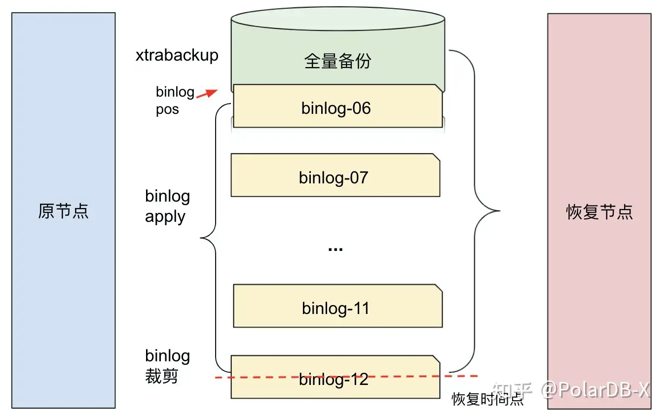 - binlog-06:由于全量备份的过程中,业务数据仍在正常写入,因此全量备份完成后,会记录备份时刻对应的binlog的pos信息,存储到备份集中,当应用binlog的时候,binlog-06 需要从全量备份集记录的pos开始apply,前面的部分需要丢弃