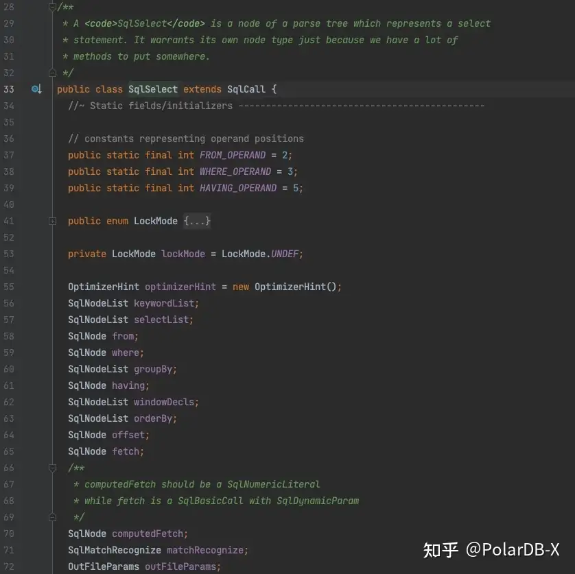 细心的同学可能注意到了,SqlSelect 本身和其中成员变量的类型 SqlNode 都在 polardbx-calcite 包而不是 polardbx-parser 包中,原因是 polardbx-sql 使用了 Apache Calcite 作为优化器框架,整个框架与 AST 数据结构强绑定,因此 SQL 解析过程首先得到 Druid 的 AST 对象,然后通过一个 visitor 转换为 SqlNode。代码在 FastSqlToCalciteNodeVisitor ,其中也包含了一些语法改写和权限校验