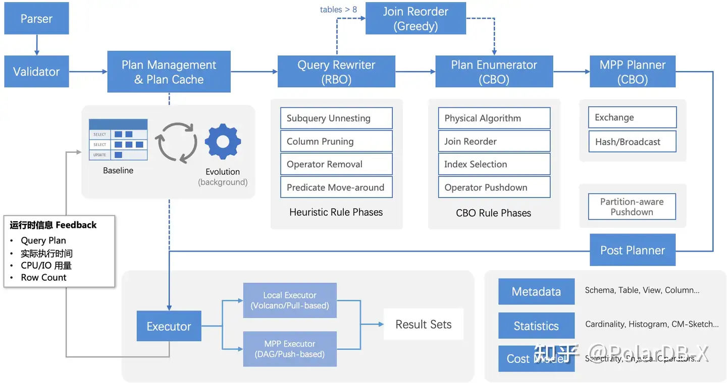 - Plan Management:包含 Plan Cache 和执行计划演进,用于消除执行计划生成带来的额外开销,和通过灰度演进避免 CBO 版本升级导致查询性能回退