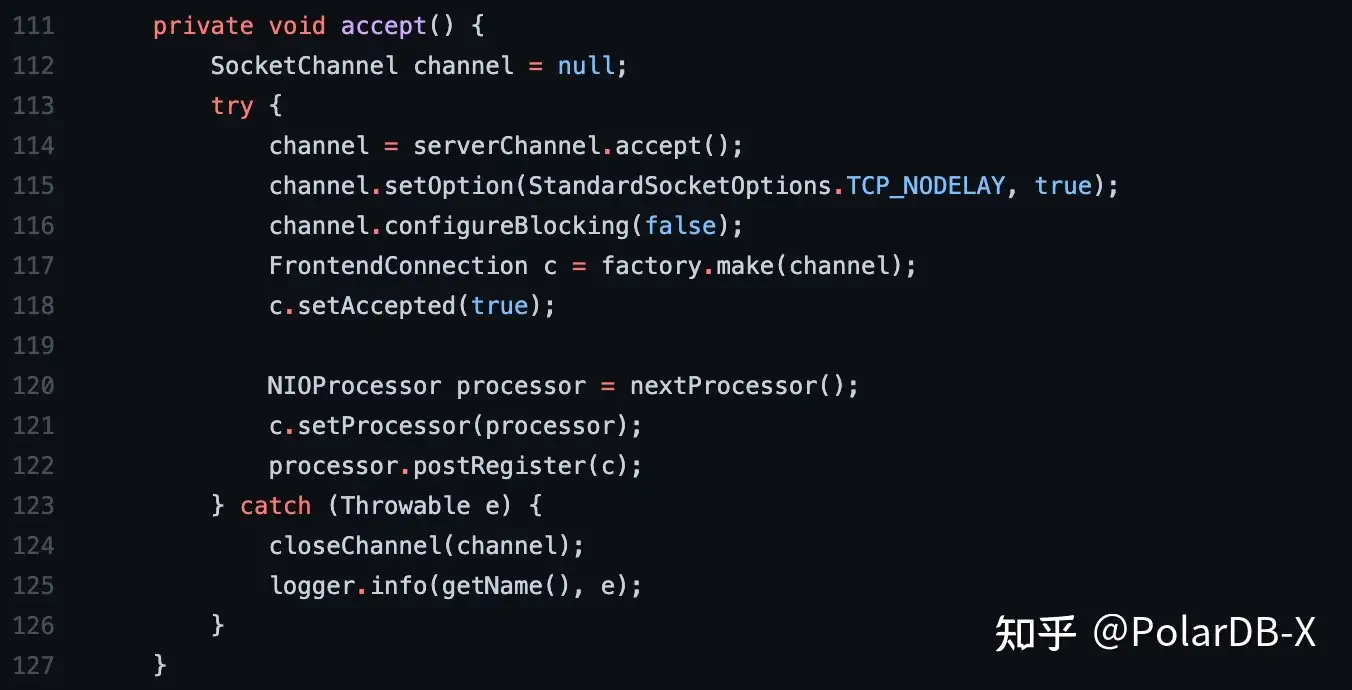 协议层首先要完成的工作是监听网络端口,等待用户建立连接,CN 启动流程 中介绍过,这部分逻辑在 NIOAcceptor 的构造函数中,每个 CN 进程只启动一个 NIOAcceptor 用于监听网络端口。