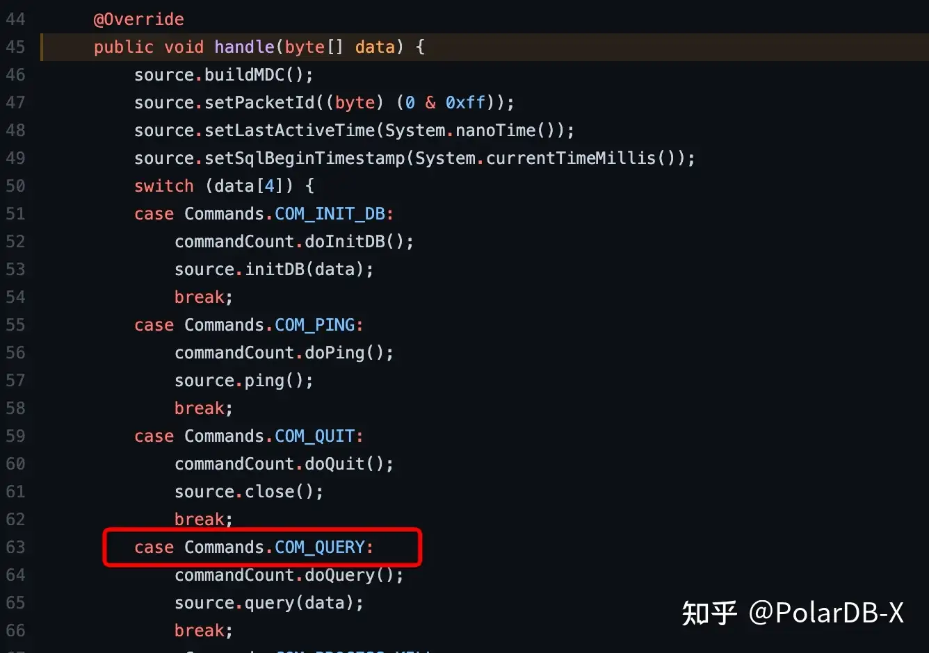 如上图所示,FrontendCommandHandler#handle 中根据 Command 类型,调用不同的处理函数,最常用的 Command 是 COM_QUERY,所有 DML / DDL 语句,只要没有通过 PreparedStatement 执行,Command 都是 COM_QUERY,对应的处理函数是 FrontendConnection#query。