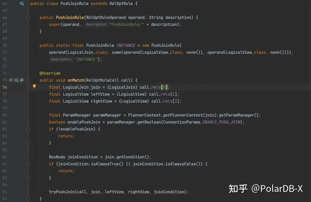 RBO 规则要实现三个固定内容,匹配的子树结构、优化逻辑、返回变换后的计划。上图展示的是用于下推 JOIN 的规则,70-72 行在构造函数中指明这个规则匹配的是 LogicalJoin 下挂两个 LogicalView 的算子树,当 RBO 框架匹配到这种子树时会调用规则的 onMatch 接口,规则完成优化后,调用 RelOptRuleCall.transformTo 返回变换后的计划。