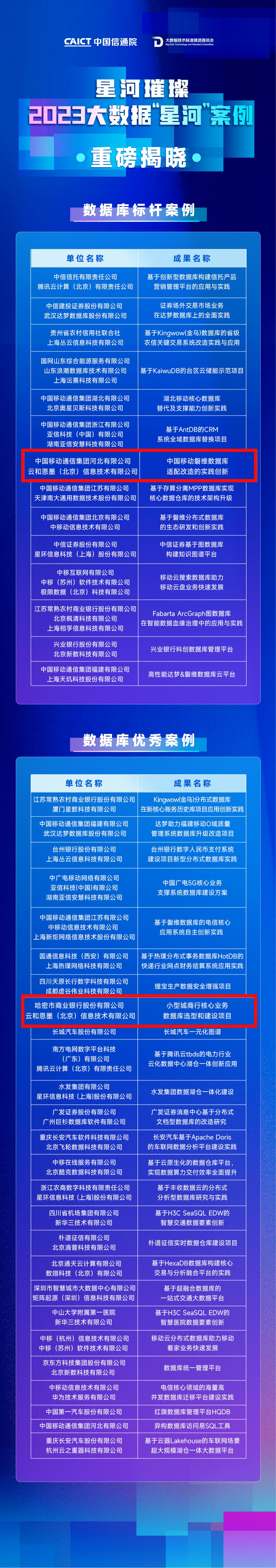 第七届大数据“星河”案例征集自9月启动以来,受到了业界广泛关注和踊跃报名,共收到申报项目706份,最终有220个案例通过评审入选。云和恩墨与河北移动联合申报的《中国移动磐维数据库适配改造的实践创新》入选数据库方向标杆案例;与哈密市商业银行联合申报的《小型城商行核心业务数据库选型和建设项目》入选数据库方向优秀案例。在河北移动磐维数据库适配改造项目中,云和恩墨助力用户完成了客户中心业务系统数据库替换技术测试和评估,利用数据库兼容性测试及迁移工具管理构筑了国产库分布式目标环境,同时完成了数据库对象改造,以及迁移完成后对数据及业务的校验工程。在哈密市商业银行的数据库相关业务建设工作中,云和恩墨同行方共同完成多项数据库架构和运维体系建设任务,帮助哈密市商业银行快速成功完成多个业务系统数据库迁移至 MogDB 的改造工作,保障了哈密市商业银行当前上线业务系统的数据库稳定、安全、高效运行。本次“星河”案例评审结果已于2023年12月6-10日进行公示,最终入选结果将在12月20-21日召开的,以“回归数据本质 应用驱动治理”为主题的⬈2023数据资产管理大会上发布,并为入选单位颁发证书。云和恩墨将在本次大会结束后,就上述入选案例带来详细解读,敬请关注!