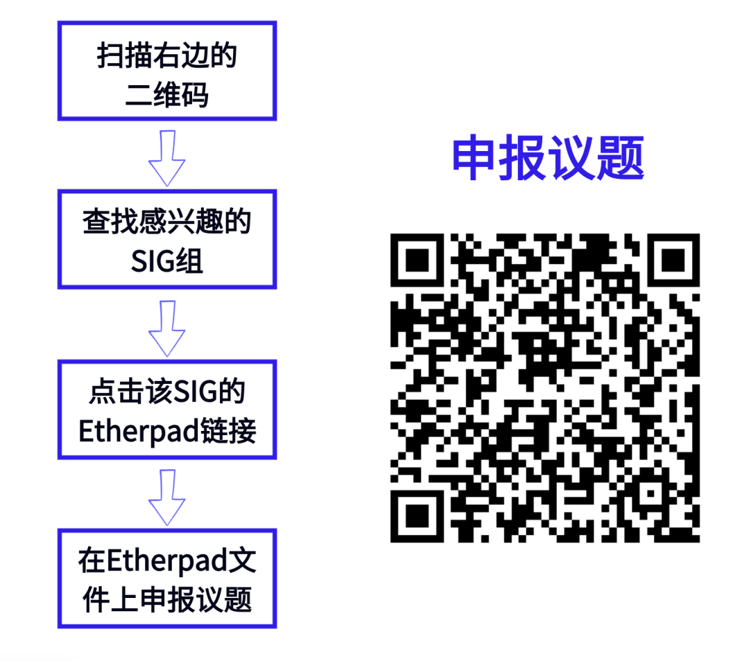 如果您有任何话题需求,可以扫描二维码,在Etherpad文件中的Topics环节提出,SIG组织者将在SIG工作会议上根据该Topic内容进行交流,共同探讨,寻求解决方案。