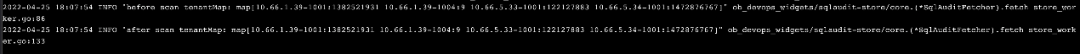 日志文件中,“before scan tenantMap” 代表一次采集过程前,每个租户在每个observer 上v$sql_audit中的request_id 值。“after scan tenantMap” 代表一个采集结束后,每个租户在每个observer 上v$sql_audit中的request_id 值。从两个map可以看出每次采集 v$sql_audit中每个租户的request_id 增量,这个增量正常情况会小于或等于“batchSendSize”配置的值。