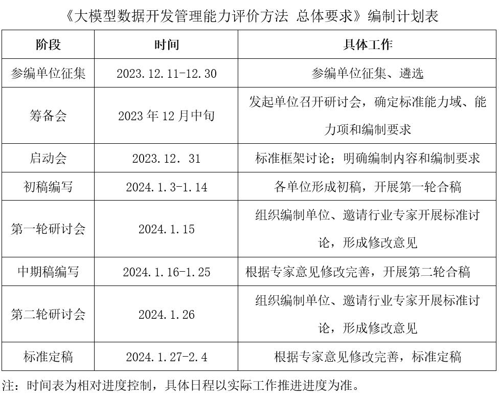 为破解大模型训练数据发展瓶颈,深入推进人工智能数据高质量发展,由中国信息通信研究院(简称“中国信通院”)牵头发起《大模型数据开发管理能力评价方法 总体要求》标准编制工作,联合发起单位包括中国联通集团、华为技术有限公司、科大讯飞、商汤科技、蚂蚁科技集团等18家单位。该标准围绕组织治理、开发维护、质量管理、资产管理、应用服务、合规可信等维度给大模型数据开发管理的全流程提供可借鉴可参考的标准规范。该标准拟于中国通信标准化协会进行行标立项。