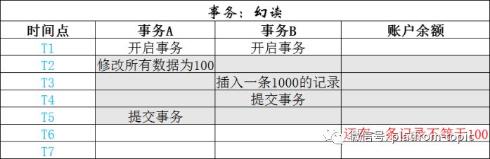 下面我们再来看看幻读,什么是幻读呢?事务A将数据表中所有数据都设置为100,此时事务B插入了一条值为200的数据并提交事务,当事务A修改完成提交事务后,发现还有一条数据的值不为100.这就是幻读的一种体现方式。如下图: