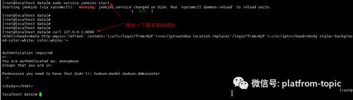 sudo service jenkins stop启动后可通过curl命令访问一下看看是否启动成功: