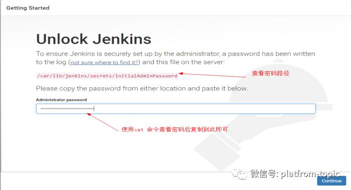 此时,可以通过本地浏览器来访问,输入ip:8080访问即可(如不可访问查阅一下端口是否有放开或防火墙信息等)。第一次通过浏览器访问时,会出现如下图所示,需要初始化密码来解锁,查看密码方法如下: