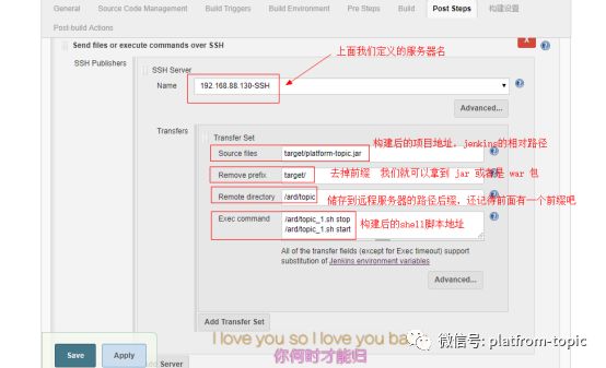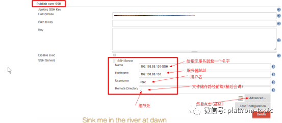 下面我们再来到项目配置里面,在项目配置里,有一个构建后操作Post Steps,我们在此处选择Send files or execute commands over SSH 安装插件Publish Over SSH 可以看到此项,这里的配置信息如下: