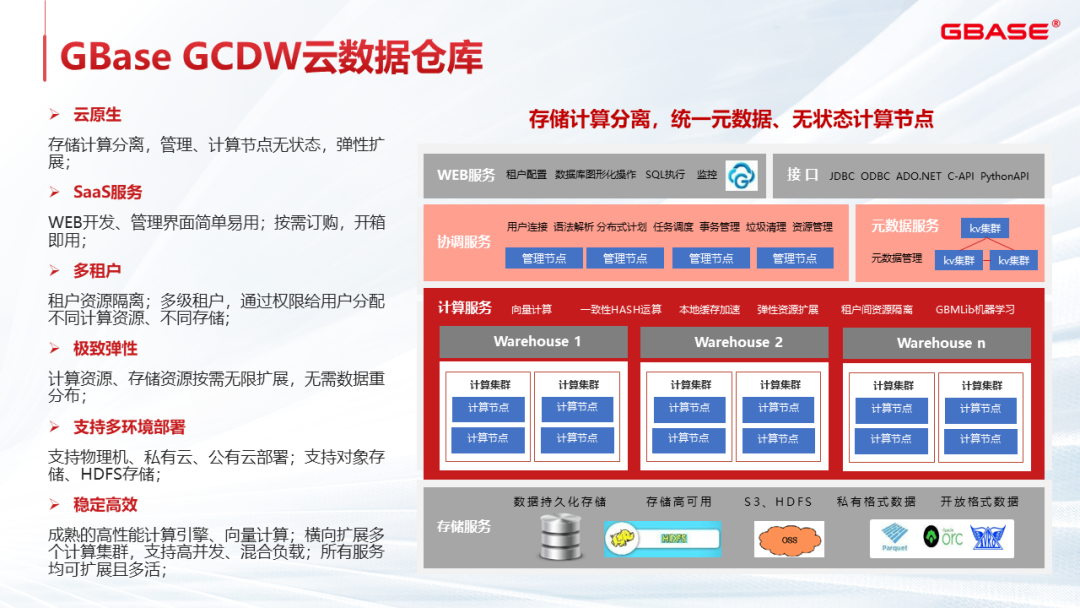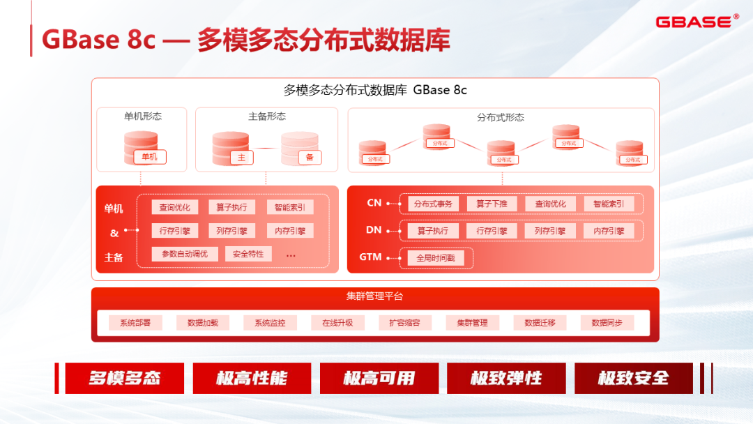 针对传统的交易场景,用户的使用场景也变得非常多元。例如对极致性能的需求,对一定规模下的在线分析需求等等。分布式交易型数据库GBase 8c,就是一款具备多模式存储和多形态部署能力的数据库产品,可以支撑上面场景下多元化诉求。GBase 8c支持行存、列存、内存等多种存储模式和单机、主备式、分布式等多种部署形态,具备高性能、高可用、弹性伸缩、高安全性等特性,从内核到工具全栈兼容国产化生态,努力支撑国产化建设。