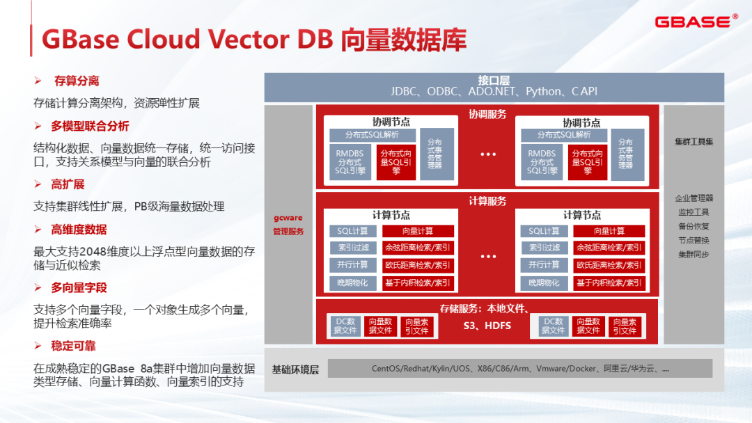 2023年11月16日,在中国数据要素产业创新大会主论坛上,国家有关部门价格监测中心副主任王建冬表示:短期看,数据基础制度可能催生3000亿-5000亿元规模的数据交易市场;中长期看,数据资产化催生的相关市场潜在规模可能达到十万亿级。面向数据要素市场化的万亿级市场,作为数据要素管理基础设施的数据库,需要具备云原生、向量处理、软硬协同、湖仓一体等能力。GBASE 将重点打造提供高性能、云原生、智能湖仓、适应并发挥新硬件特性、人工智能与数据库技术相融合的数据库产品和服务。