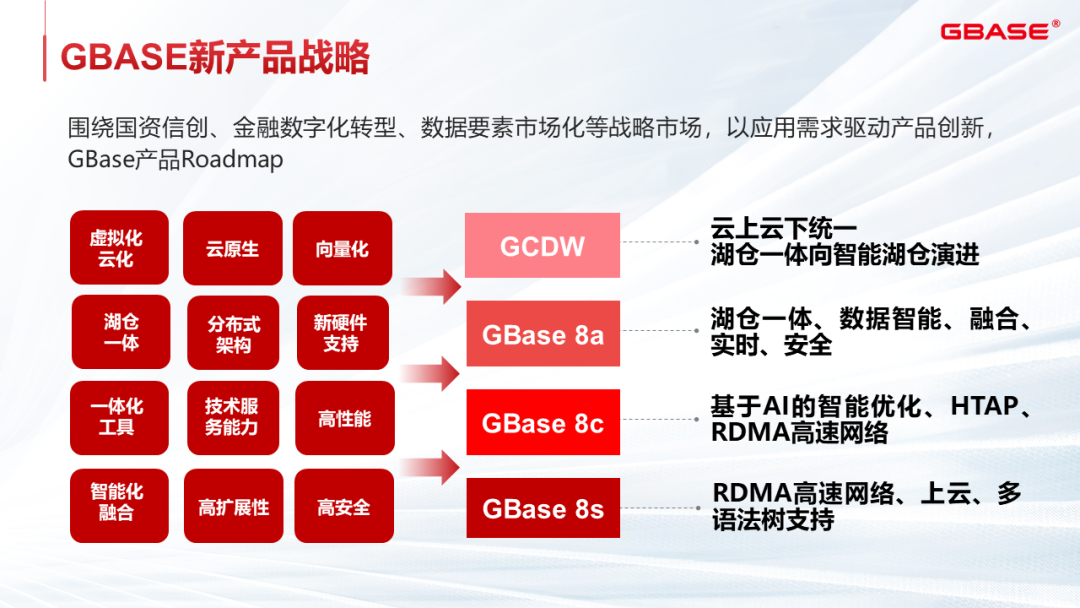 围绕国资信创、金融数字化转型、数据要素市场化等战略市场,以应用需求驱动产品创新,GBase 产品 Roadmap。