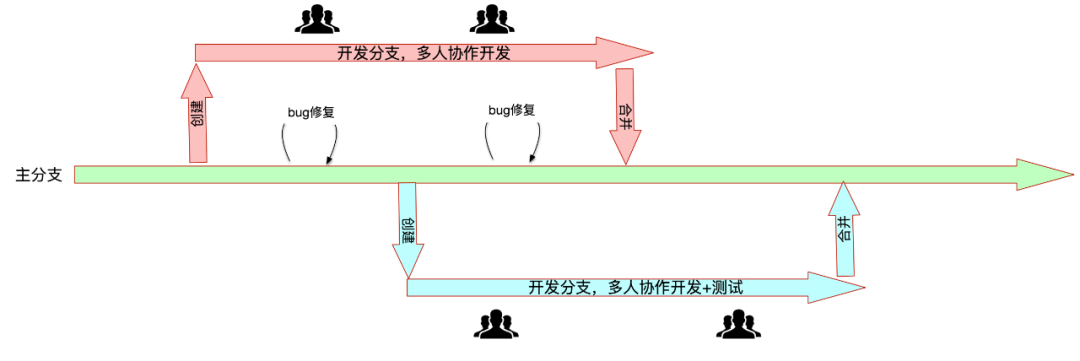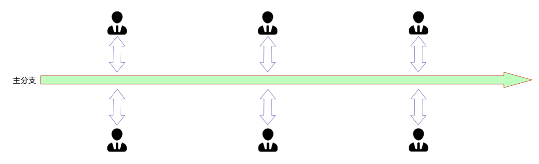 一个软件在刚开始开发时,并不存在线上稳定版本的代码运行问题。我们往往只需要考虑一个代码主分支,多位开发者在一个主分支上进行代码推拉合并,进行协作开发。