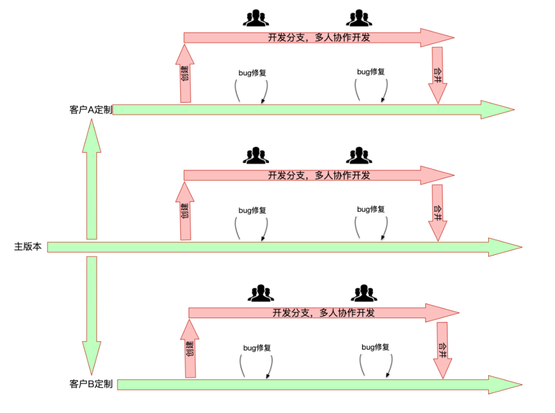 在这种情况下,产品往往要专门引入一类角色——SCM(软件配置管理工程师),来专门对代码版本进行维护,基于每个定制版本的生命周期建立一套复杂的代码合并规则。