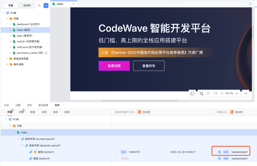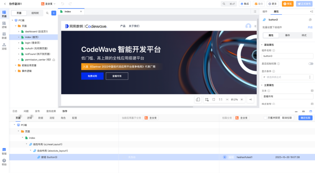 为此,CodeWave设计了页面组件级的细粒度的合并能力,使得多位开发者可以精细化的进行代码合并拉取,最大化满足各类灵活的协作开发场景。
