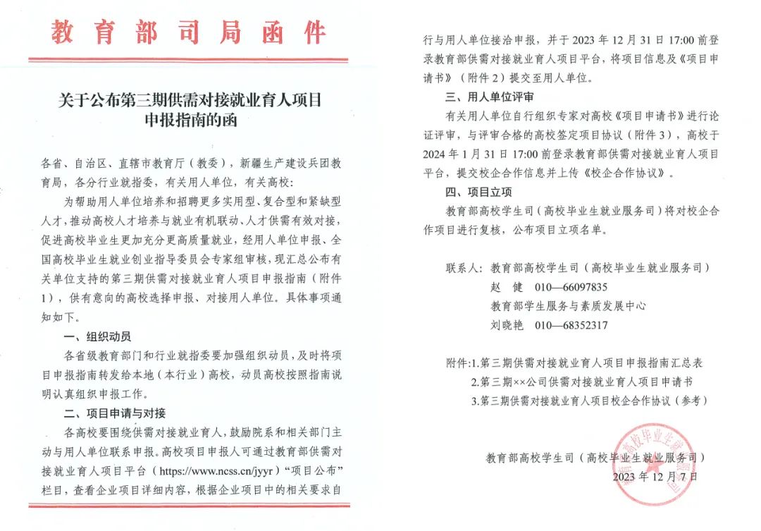 公司组织专家对高校《项目申请书》进行论证评审,与评审合格的高校签定项目协议,请高校申报人于2024年1月31日17:00前登录教育部供需对接就业育人项目平台,提交校企合作信息并上传《校企合作协议》。