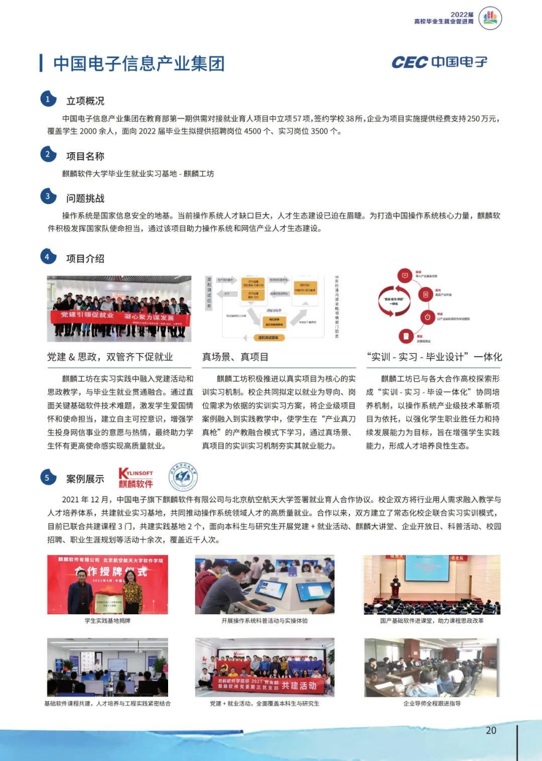 自参与教育部供需对接就业育人项目以来,麒麟软件累计与北京航空航天大学、南开大学、天津大学、深圳职业技术大学、天津市职业大学等全国46所高校成功立项71个项目,校企协同开展定向人才培养培训、人力资源提升、就业实习基地等方面合作,有效地推动了高校网信人才培养与就业的有机联动。其中,“麒麟软件大学毕业生就业实习基地——麒麟工坊”项目,以“真项目”、“真场景”、“真实践”的三真特色,将生态适配、移植技术等大量产业真实项目带进学校,打造网信领域“引产入校、工学结合”新模式,助力学生有使命感的高质量就业。
