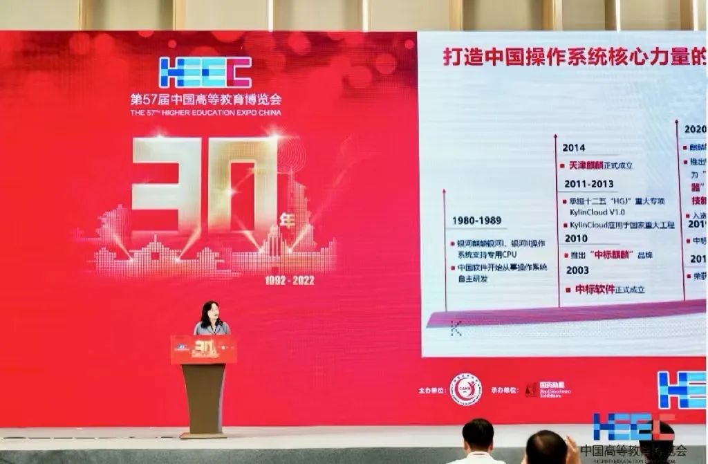 该项目由中国电子选送、并成功入选2022届全国普通高校毕业生就业促进周就业育人项目精选案例,并在第57届中国高等教育博览会第一届中国高校就业育人大会上,由麒麟软件副总经理张娜作《麒麟遨天 育才铸魂——麒麟工坊助力高校学生实践能力提升》主题报告系统介绍。