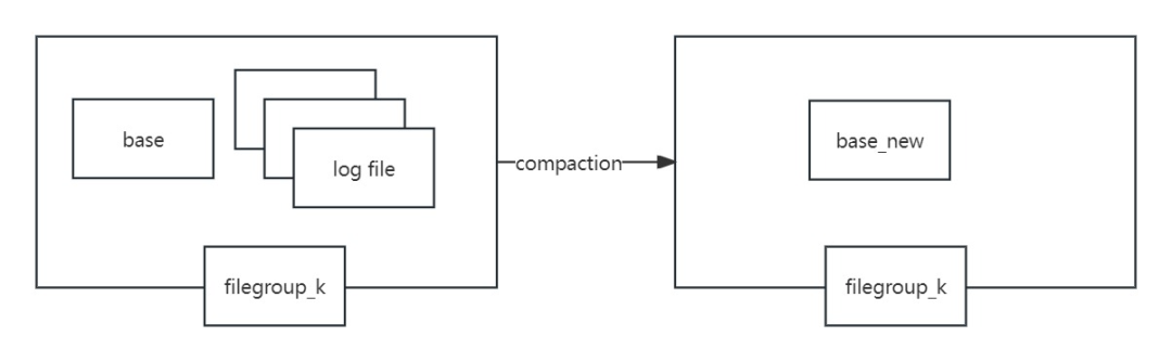 Compaction即base parquet文件与相同FileGroup下的其余log文件进行合并,生成最新版本的base文件。如下图所示: