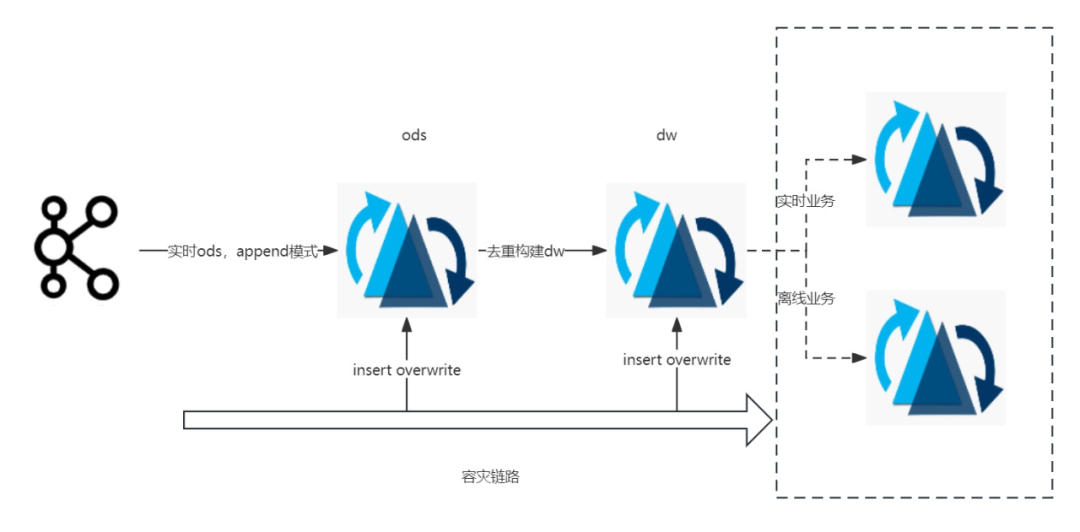 上游从Kafka以append模式接入ods的cow表,下游部分dw层业务根据流量大小选择不同类型的索引表,比如bucket index的mor表,在数据去重后进行dw构建,从而提供统一数据服务层给下游的实时和离线的业务,同时ods层和dw层统一以insert overwrite的方式进行分区级别的容灾保障,Timeline上写入一个replacecommit的instant,不会引发下游流量骤增,如下图所示: