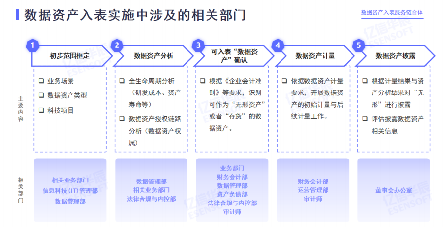 就像数据治理这件事一样,目前“数据治理”在业内已提高到“公司治理”的范畴,所以数据资源入表同样也一定是企业级自上而下推动的,需要董事长、高级管理层去推动。但可以认定某一个部门作为主牵头部门,其他所有部门都要参与进来,而且不只是简单的参与,都要作为数据的核心或者说数据的属主部门一起来推动。
