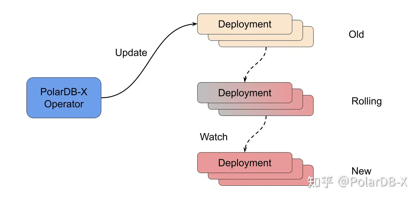 当检测到需要进行 CN、CDC 组件的扩缩容时,operator 会根据当前 PolarDBXCluster 对 CN、CDC 的描述重新构建相应的 Deployment 组,并将其应用到 Kubernetes 中,剩下的工作交给 Deployment 的控制器完成就可以,operator 只需要等待它们完成(rolled out)。