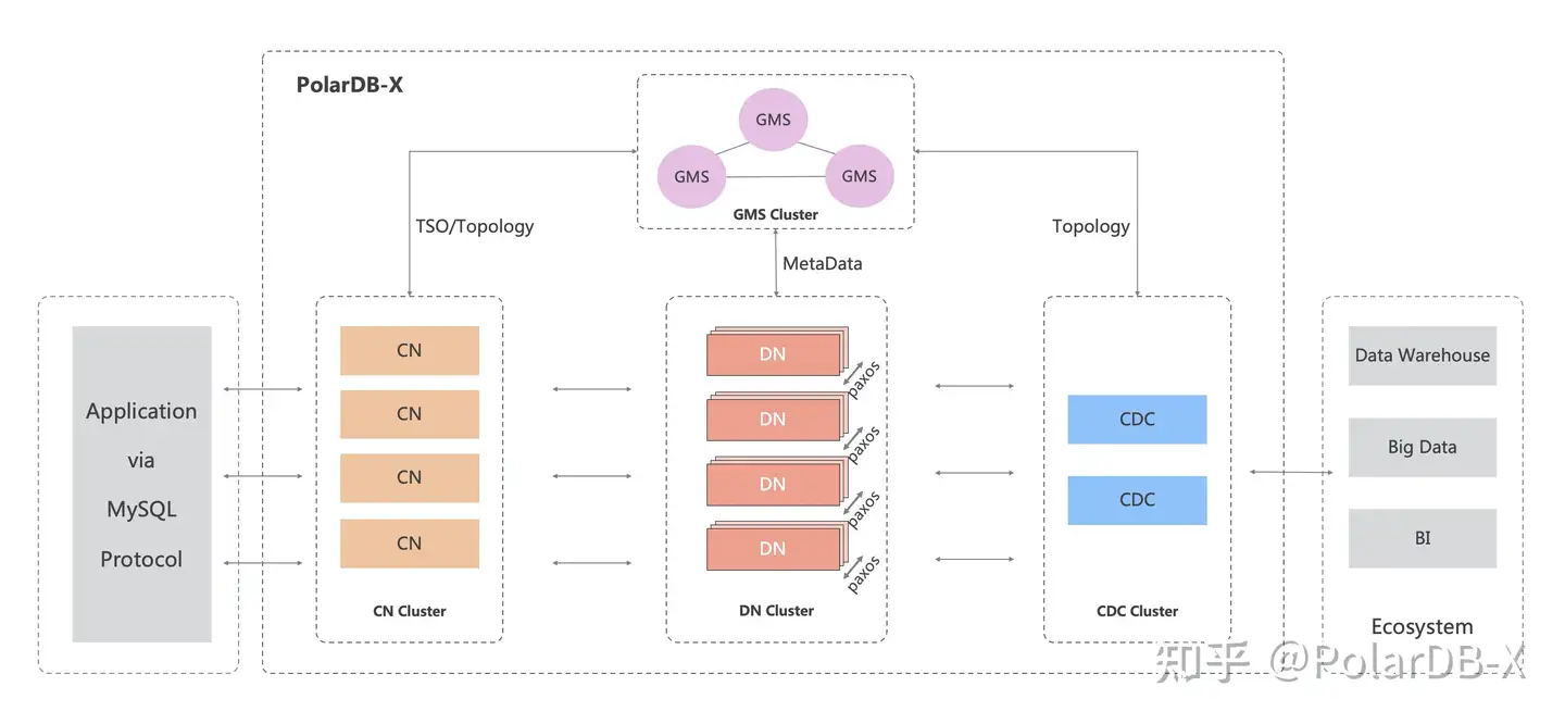 在介绍弹性扩缩容的原理之前,我们先回顾一下 PolarDB-X 集群的整体结构,如下所示:
