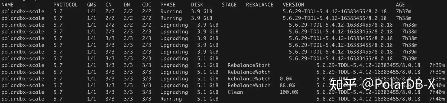 kubectl get polardbxcluster polardbx-scale -o wide -w- 集群从 2 个 CN、2 个 DN、2 个 CDC 扩容到各 3 个