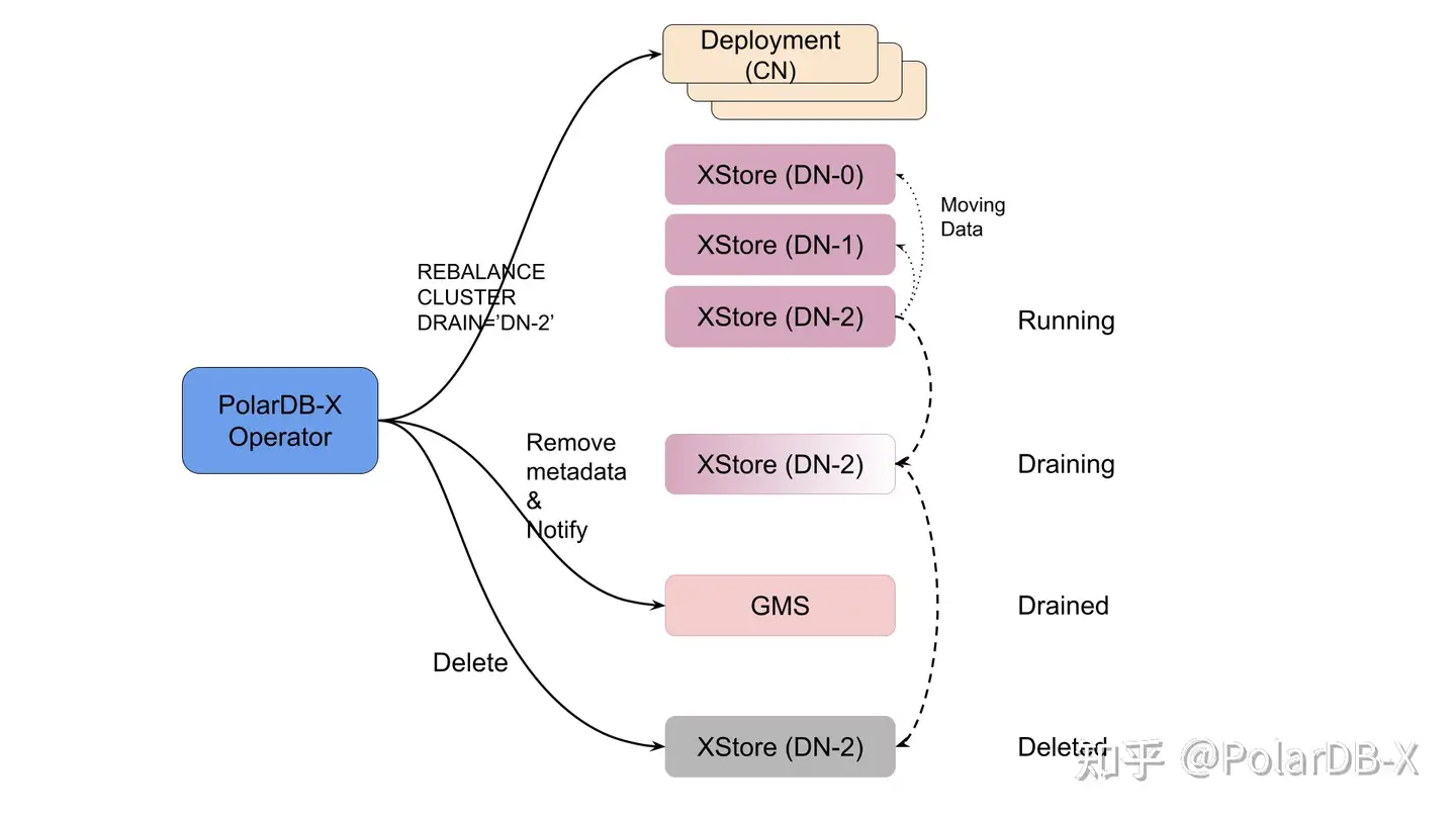 在缩容的场景中,operator 也是挑选编号最大的那几个 DN,将它们删除。等等,那数据怎么办?缩容场景下,这些 DN 上的数据一定要先搬迁到剩余的 DN 之上。PolarDB-X Operator 通过调用 CN 提供的接口来进行 DN 的下线(逻辑删除):