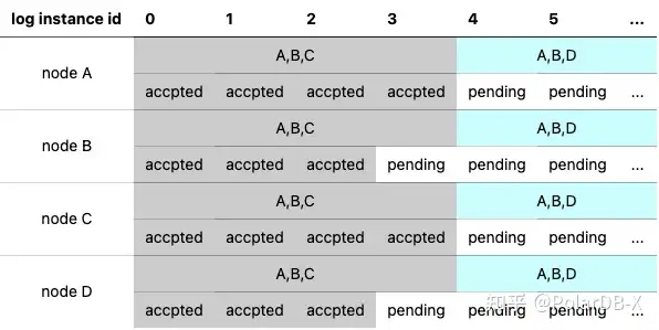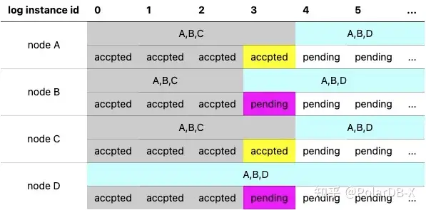 之所以 RAFT 不采用一步变更,是因为一步变更会在中间状态中出现不交叉的多组 quorum,如下面样例中的场景,需要将C节点替换为D节点,在 log instance id 3上,由于延迟等原因,A和C节点还没有进行成员变更,还认为成员是ABC,AC作为 quorum 进而 accept 了一个 value,而对于知道最新成员为ABC的BD两个节点,仍可以作为 quorum 去 accept 另外一个值,这就导致了 Paxos 算法失效。