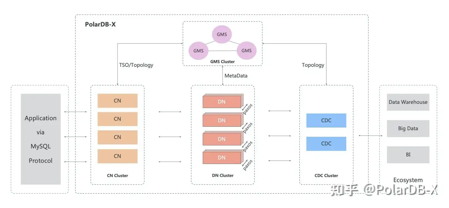 PolarDB-X 采用 Shared-nothing 与存储分离计算架构进行设计,系统由4个核心组件组成。