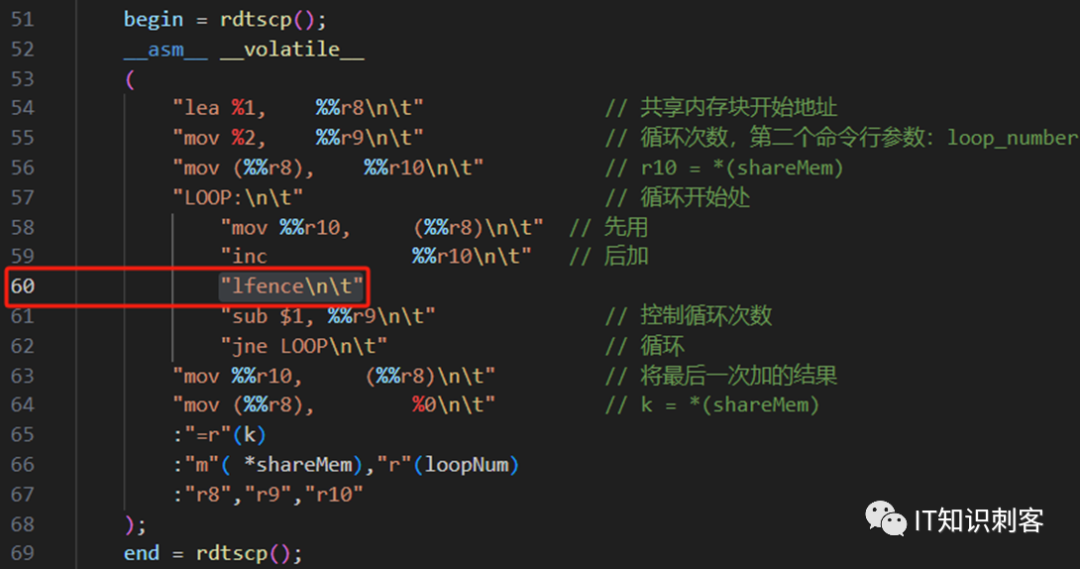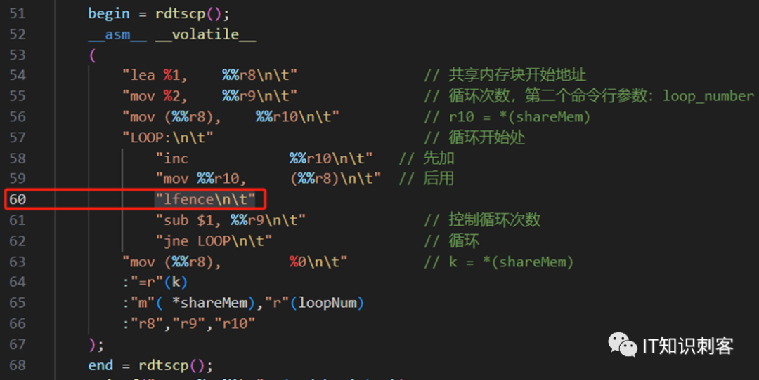 第60行,有一个lfence,它可以挡住后面的指令不执行,也是CPU提供的三大屏障指令中的一个。